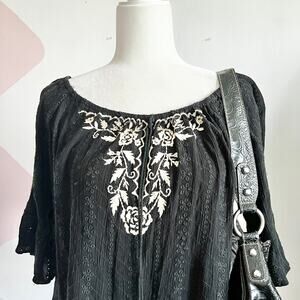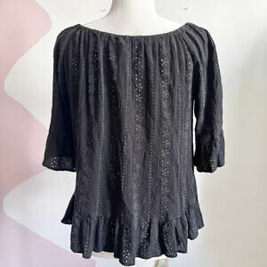 Black Eyelet Embroidered Peasant Top, Boho Cottagecore Y2K Romantic Large