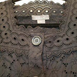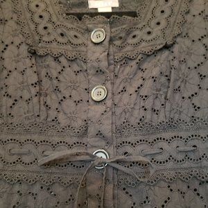 Black Eyelet Tunic Top, Drawstring Waist, Button Front, Square neckline, Size S