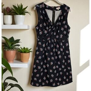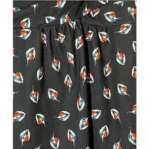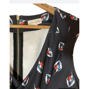This dress is flattering! It's solid black with a red, white, & blue eye-catching feather pattern. It has a sleeveless surplice design. In gently used condition with some light piling here and there. Not obvious unless looking for it.