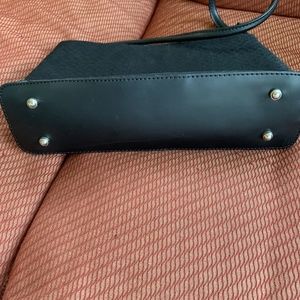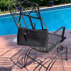 Subtle status-like print pattern on the fabric; silver tone hardware; outside zipper on back. . Feet to keep the bottom off the ground.