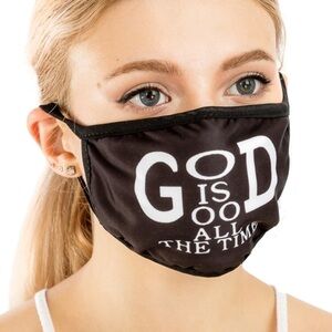 Wide Black Face Mask w/Words in White - “God is Good All the Time”. OS