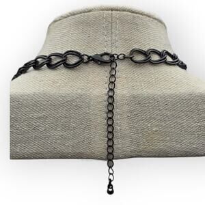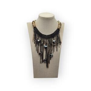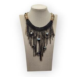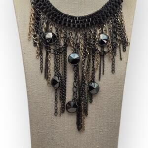 Bold and dramatic, this statement necklace is designed to turn heads. Featuring layered gunmetal and antique gold-tone chains with dangling faceted black beads, it offers a striking mix of edgy and elegant. The necklace weighs approximately 4.6 oz before packaging, giving it a substantial, high-quality feel when worn. Perfect for elevating an evening look, adding drama to a concert outfit, or making a fashion-forward statement with everyday style. Adjustable lobster clasp closure ensures a comfortable fit.