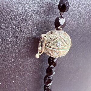Black Faceted Beaded Clear Rhinestone Station Long Necklace Silver Tone