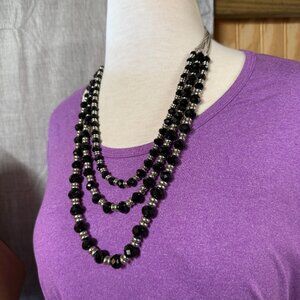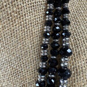 Black Faceted Beaded Necklace Three Strand Silver Tone Accents Vintage Classic