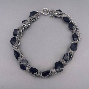 Black Faceted Beaded Silver Tone Chain Wrap Necklace Toggle Closure 19 Inch