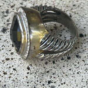 This is a estate piece of jewelry! Beautiful square faceted black stone surrounded by pave-set clear stones, and a twisted cable silver-tone band.