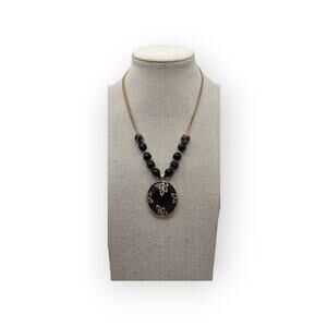 Black Faceted Gold Leaf Filigree Detailed Pendant Necklace