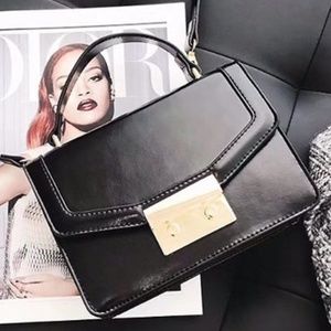 Faux leather fashion shoulder bag with handlebar and detachable strap. Features a gorgeous, classy looking outside style, short handlebar, metallic lock bar, two inside compartments, black interior, and faux leather detachable strap.