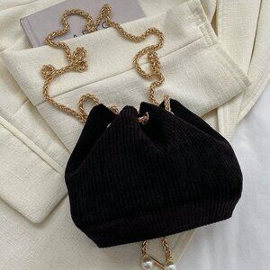 Black Fashionable Women's Chain & Faux Pearl Decor Bucket Bag Polyester