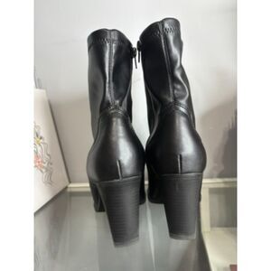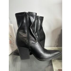 Sleek black ankle boots made from faux leather, featuring a pointed toe, side zipper closure, and sturdy block heel. A versatile and chic choice for everyday wear or evening outings.