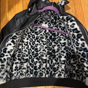 Made of faux leather with a soft faux fur lining, this short jacket features long sleeves and a full zipper closure.