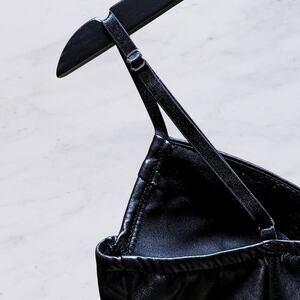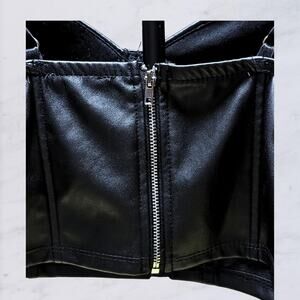 Black faux leather bustier / corset top with silver faux diamond detailing / fringe.
