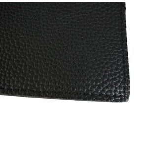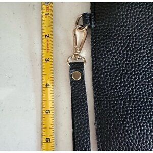 This stylish black clutch wristlet is crafted from durable faux leather, featuring a sleek gold ring closure. Ideal for organizing essentials with elegance, it offers a chic and sophisticated touch. The removable wrist strap provides versatility and convenience, making it suitable for various occasions and settings.