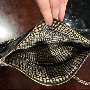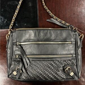 Stylish black leather crossbody bag with elegant chain strap. Perfect for any occasion.