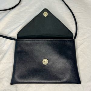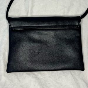 •This minimalist yet elegant black faux leather purse can be worn as a cross body bag or a one-shoulder purse. •One compartment that secures shut with a magnetic button closure.