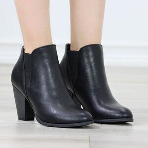 Black Faux Leather Heeled Ankle Booties Elastic Side Panels Stacked Block Heel