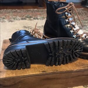 Faux leather black boots with brown laces, faux fur and side zip feature to easily get on and off. Gently worn. True to size.