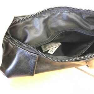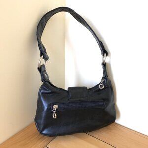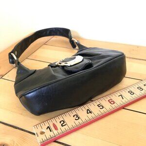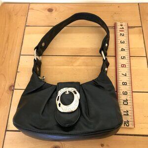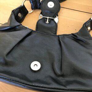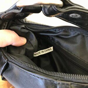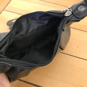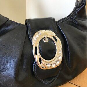 Black faux leather mini bag has silver-tone decorative buckle with rhinestone accents. Magnetic closure with top zipper, small inner zip pocket and outer zip pocket on the back of bag. 10 long x 5 tall x 2 1/2 thick. Strap is 15 long. Very good condition, appears unused.