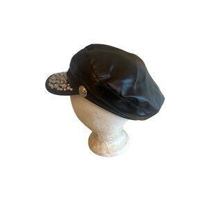 Black Faux Leather Rhinestone Embellished Baker Boy Hat Biker Moto One Size