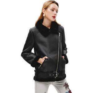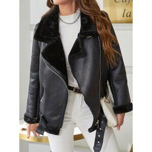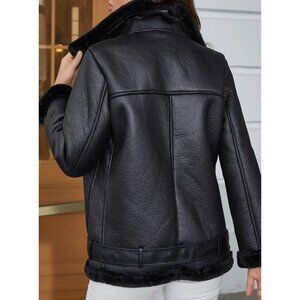 Black Faux Leather Sherpa Fur Jacket Moto Biker Zip Up Collared Winter Coat