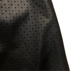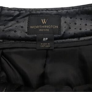 Black faux leather short pleated skirt by Worthington. High waist. A line skirt. Cutout pattern. Fully lined. 100% polyester. Back zipper closure. 2 side pockets. Machine wash cold. Line dry. Great to pair with knee high boots, cute tights and booties, or a satin blouse and stilettos. New without tags.
