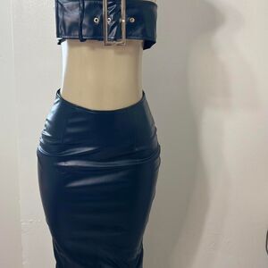 Edgy and bold — this black faux leather set features a strapless buckle crop top and a matching high-waisted zip-up pencil skirt. Perfect for a night out, concert, or statement look.