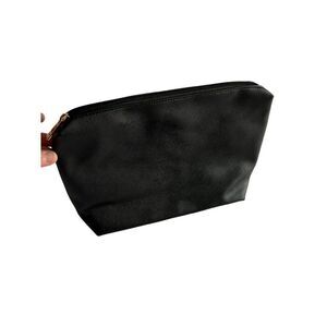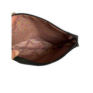 Elegant black faux leather zippered pouch featuring a vibrant floral interior. Ideal for storing cosmetics, toiletries, or small essentials.