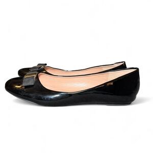 Classic black ballet flats with a glossy faux-patent finish and fabric bow with gold-tone accent. Round toe, slip-on style, cushioned insole. Versatile for work or casual wear.