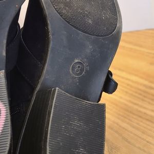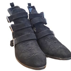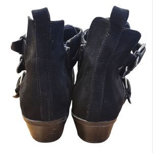 cute little pair of faux suede buckle ankle booties in size 8. excellent used condition.