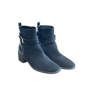 These sleek ankle boots blend faux suede and croc-embossed detailing for a sophisticated look. Featuring a gold-tone accent at the heel, a side zipper for easy wear, and a comfortable block heel, they are versatile and stylish for various outfits and occasions.