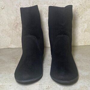 These black faux suede ankle boots feature a sleek design with functional buckle detailing. Their rubber sole offers durability and everyday comfort, suitable for versatile wear.
