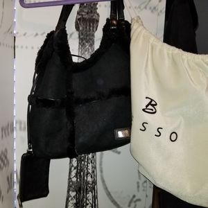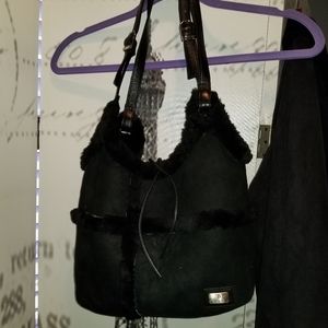 Black shoulder strap purse..faux suede and fur with change purse attached. Matching Hat and Jacket sold separately..which is posted. Excellent condition.