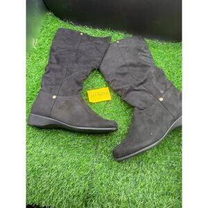 Black- Faux Suede-Thigh High Boots- Size 7W (approx). Simple, comfy and cute, these boots go with everything. Perfect for leggings or jeans. They are in great condition, lightly worn. Brand unknown, size is aproximate. Clean and ready to style!! Great value!!