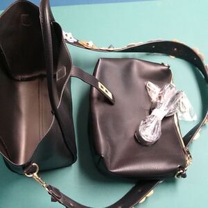 Black Faux Leather Two Crossbody Straps Certified Vegan Bag with Floral Strap
