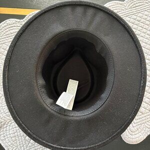 Black polyester felt fedora with a thin gold band accent. Structured shape with a wide, stiff brim that holds well. New without tags. No flaws. Gold tone chain around brim. Approx. measurements: around inside 20", base of crown to. outer edge 3", top of crown to bottom of hat 6", side to side across 13".