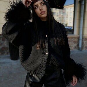 Black Festive Women's Furry Cuffs Metal Buttons Cardigan
