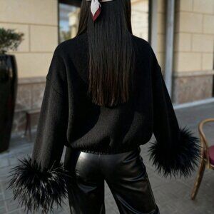 Embrace the season with a festive cardigan that blends casual comfort and seasonal style. The loose silhouette drapes gently, while the round neck adds a classic touch. Long sleeves keep warmth close, and the regular length offers versatile layering over dresses or tees. this piece brings a subtle sparkle to any winter wardrobe with its faux fur fluffy sleeve ends