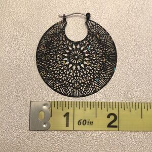 Black Filigree Hoops with Multicolored Flecks. Delicate Lacey Design. Ultra Lightweight.