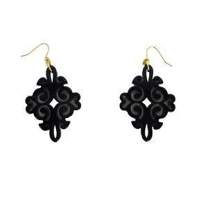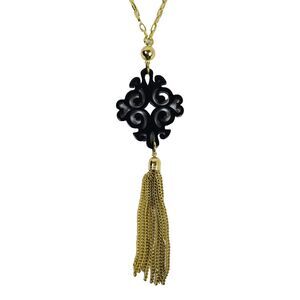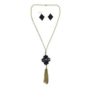 Black Filigree Medallion Necklace & Earring Set with Gold Chain & Tassel Accent