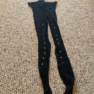 Z Tights M/L. These were used in a dance recital & the rhinestones were added. There’s 9 on one leg & 10 on the other but can be removed with blow dryer.