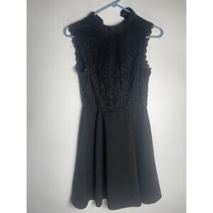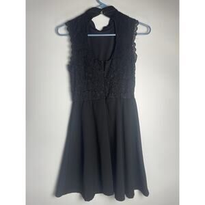 Only worn once! This dress is lacy up top with a high neckline, a slightly flared skirt, and a keyhole back with buttoned closure. Adorable for cocktail parties or date night.