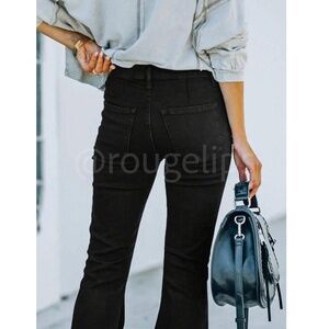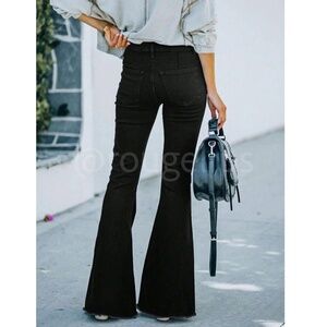 Black Flare Leg Distressed Jeans Zipper High Waist Stretchy