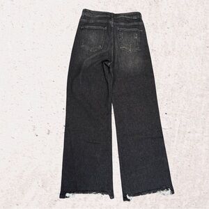 These black jeans feature a high-waisted design with a wide, relaxed leg that flares out for a stylish silhouette. The raw, frayed hem adds an edgy touch, while the distressed detailing gives them a vintage, worn-in look. Perfect for making a bold fashion statement.
