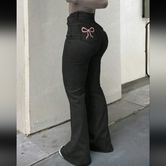 Stylish black flared jeans featuring a cute pink bow detail on the back pocket.