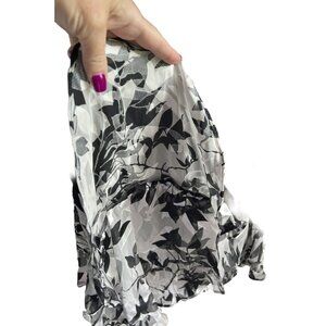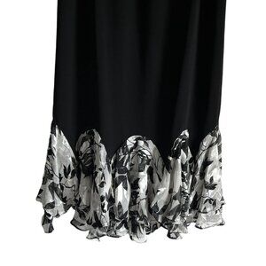 This elegant black skirt features a striking floral two tier ruffle hem, adding a touch of sophistication to your wardrobe. With an elastic waistband for comfort, it offers a flattering fit. Very unique piece. Pre owned and in good condition
