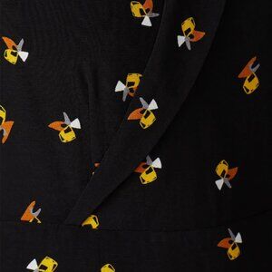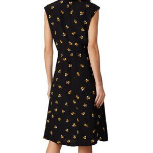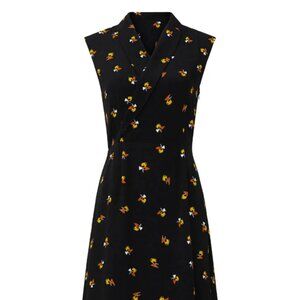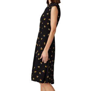 Black and floral printed woven (100% Viscose). Hourglass. Sleeveless. V-neckline. Hidden side seam zipper closure. Fully lined. 43" from shoulder to hemline. Made in the USA.