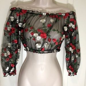 Beautiful sheer black top with red and white floral stitching. You’ll get so many compliments in this!
