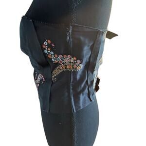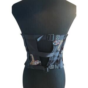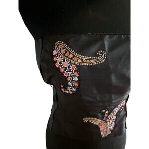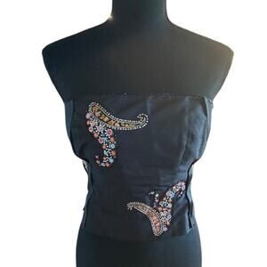 Black strapless corset-style top with colorful floral paisley embellishments. Adjustable buckle straps across the back. Side zip closure. Boning structure for support. No size or fabric tag—appears to fit size small to medium.