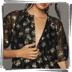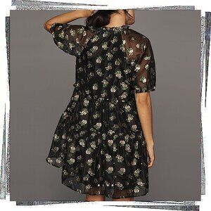 Gorgeous black floral embroidered (white roses with green leaves) puff sleeve v-neck tiered tunic mini dress. I wore this several times and it's in new condition