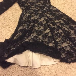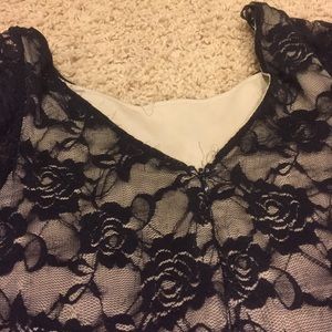 This dress is a black floral lace, and would be very pretty on any skin tone. For the body and skirt of the piece the lace is layer over a medium beige fabric, and the sleeves are black lace. The fit is nice through the top, and the skirt length is a decent length for many heights.